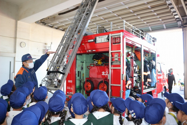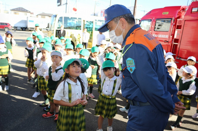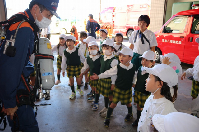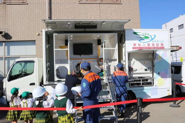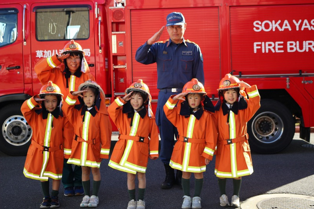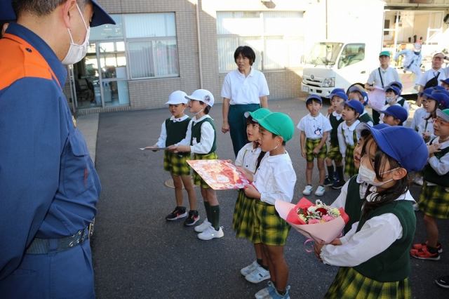 草加消防北分署を訪問して、消防車を近くで見学したり、消防車の装備について学習してきました。消防服を着て記念撮影をしてもらったり、起震車に乗って地震のゆれを体験したりしました。最後に、勤労感謝の心を込めて、自分たちで製作した作品と花束をプレゼントしました。
