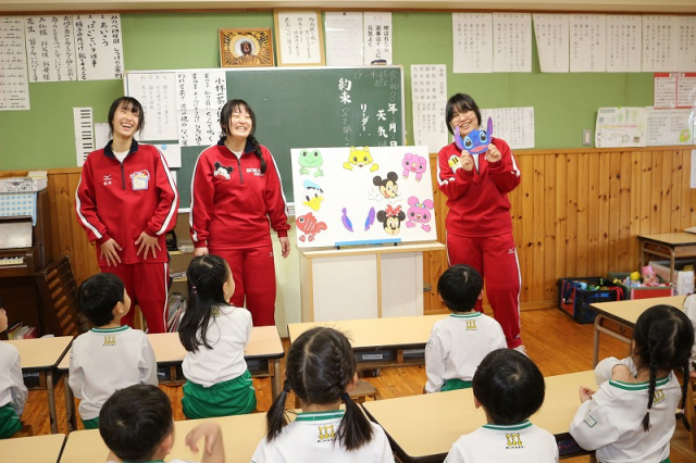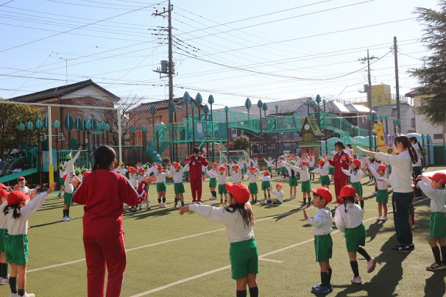 草加西高校3年20名のお姉さんたちが、保育体験学習の実習で当園に来てくれました。園庭での体育運動活動を補助してもらったり、一緒に遊んでもらったり、お部屋ではパネルシアターを披露してもらったりして、園児たちの笑顔がたくさん見られました。