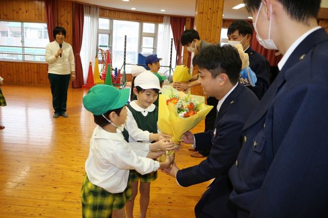 草加警察署交通指導課のお巡りさんと、草加市役所交通対策課の職員の方にお越しいただいて、横断歩道の渡り方や信号機の見方を指導していただきました。