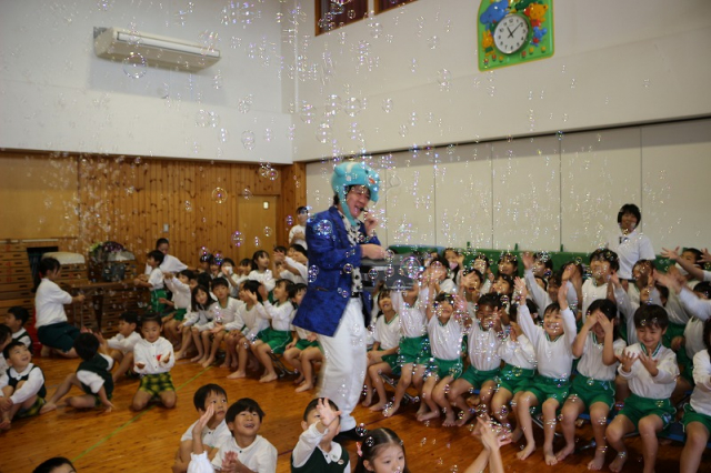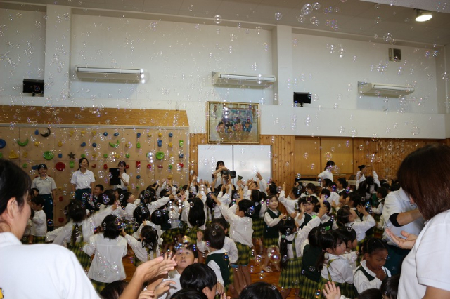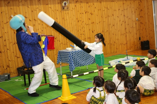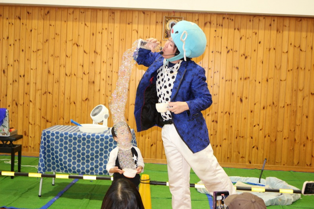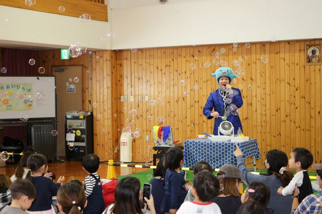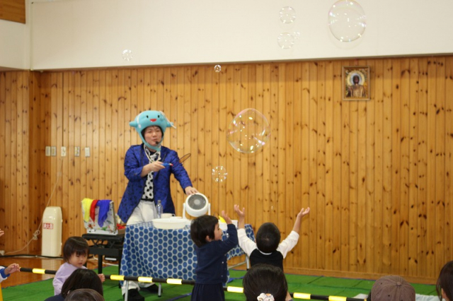 パフォーマーのTOMOさんにお越しいただき、マジカルシャボン玉ショーが開催されました。園児たちは、マジックに目を丸くしてシャボン玉に歓声をあげました。未就園児のお友だちにも、シャボン玉ショーを楽しんでいただきました。