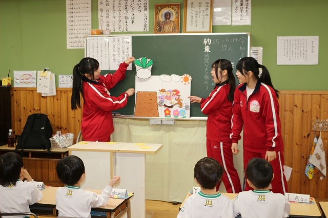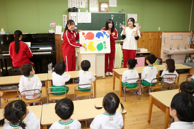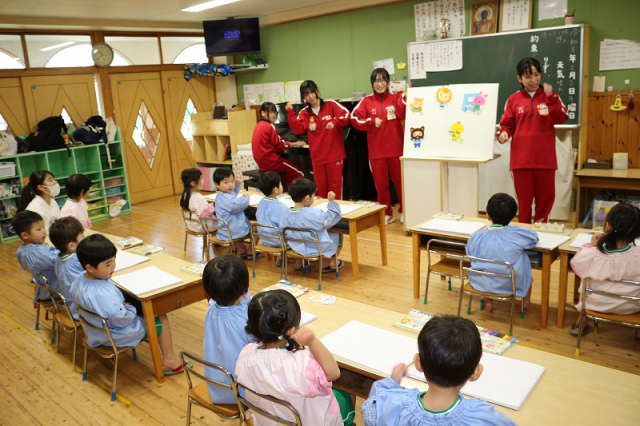 草加西高校3年20名のお姉さんたちが、保育体験学習の実習で当園に来てくれました。園庭での体育運動活動を補助してもらったり、一緒に遊んでもらったり、お部屋ではパネルシアターを披露してもらったりして、園児たちの笑顔がたくさん見られました。
